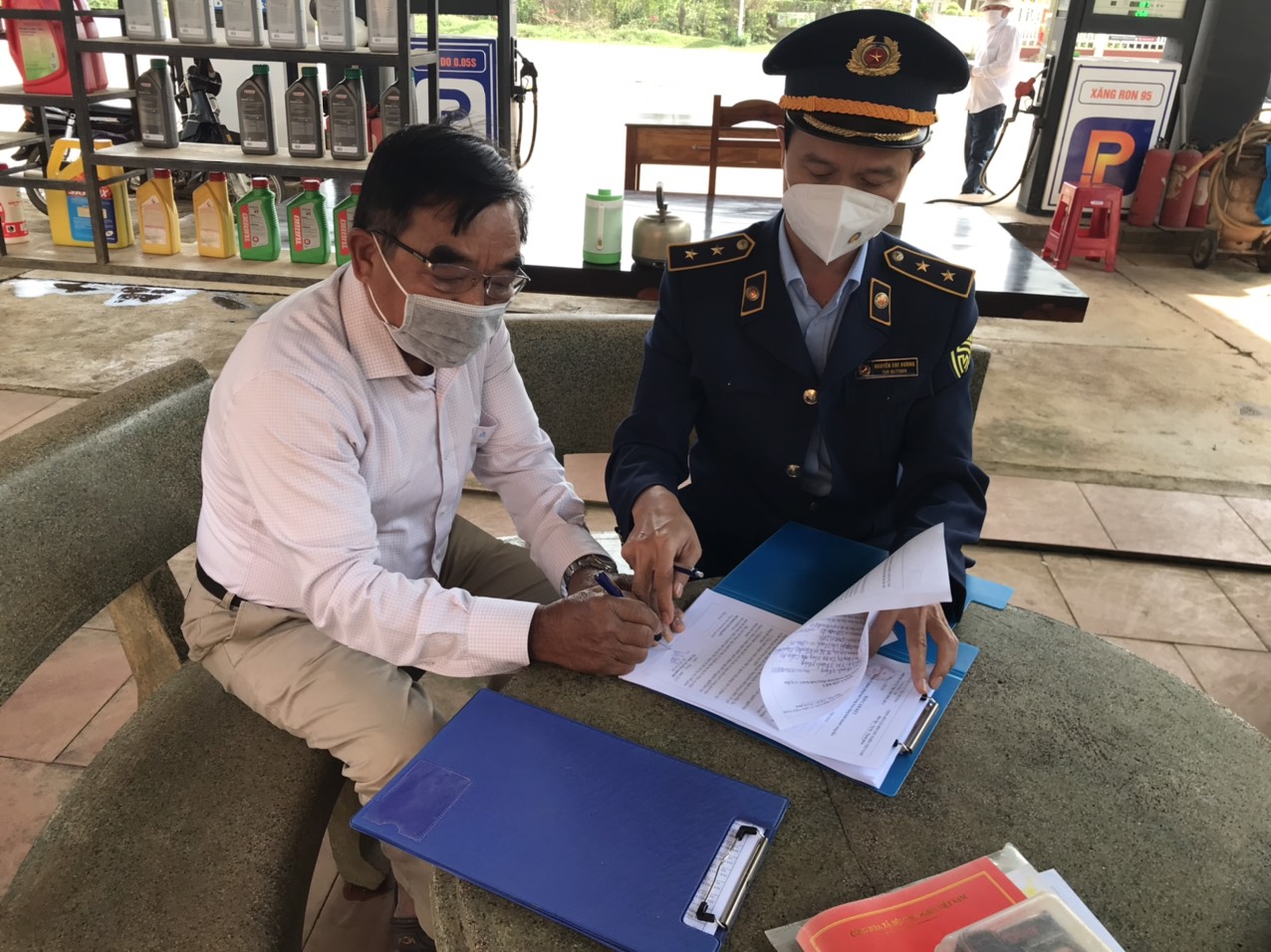 Công chức Cục Quản lý thị trường tỉnh Đắk Lắk thực hiện ký cam kết với cơ sở kinh doanh nhằm phòng ngừa các hành vi vi phạm trong hoạt động kinh doanh xăng dầu.