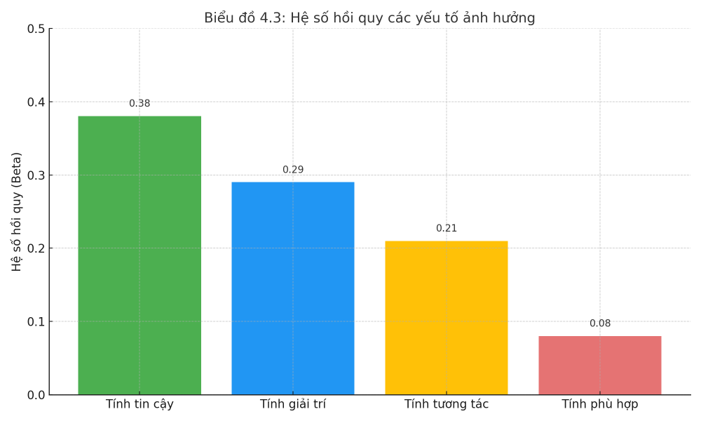 Trong số các yếu tố, tính tin cậy có hệ số hồi quy cao nhất (β = 0.38, p < 0.01), tiếp theo là tính giải trí (β = 0.29, p < 0.05) và tính tương tác (β = 0.21, p < 0.05). Tính phù hợp tuy có ảnh hưởng dương nhưng không đạt ý nghĩa thống kê trong mô hình. Biểu đồ 3 thể hiện hệ số hồi quy của từng yếu tố trong mô hình.
