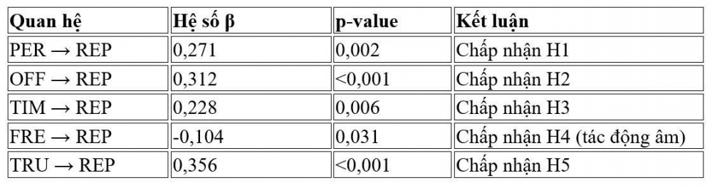 Kết quả SEM cho thấy 4 yếu tố tác động tích cực đến ý định mua lại gồm giá trị ưu đãi, tính tin cậy, cá nhân hóa và thời điểm gửi. Trong đó, tính tin cậy (β = 0,356) và giá trị ưu đãi (β = 0,312) có mức ảnh hưởng mạnh nhất. Đáng chú ý, tần suất gửi thông báo có tác động âm đến ý định mua lại (β = -0,104), phù hợp với các nghiên cứu trước về sự khó chịu do thông báo quá nhiều.