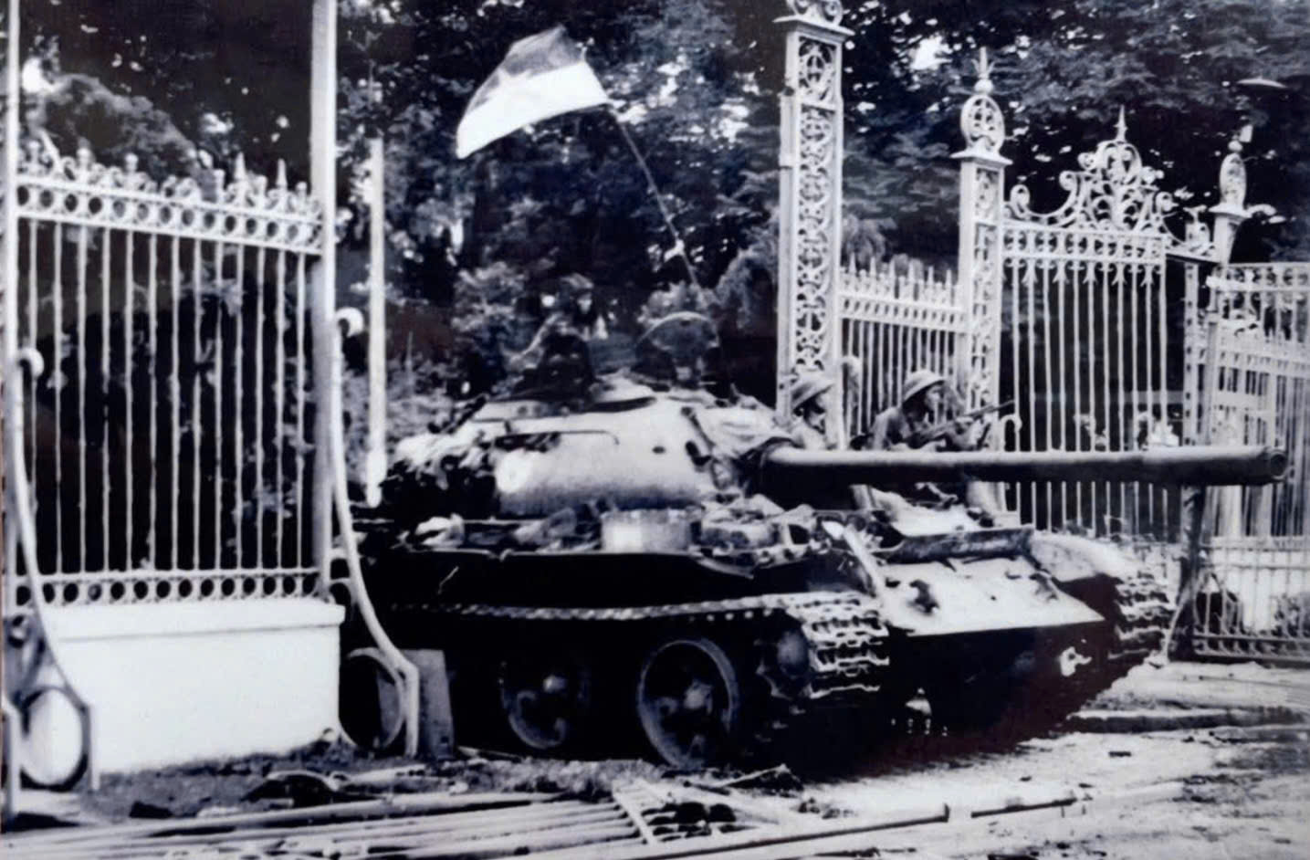 Xe tăng Lữ đoàn 203 tiến vào Dinh Độc Lập trưa ngày 30/4/1975 (Ảnh do nhà báo Ngọc Đản chụp lúc 11h30 ngày 30/4/1975, nguồn ST).