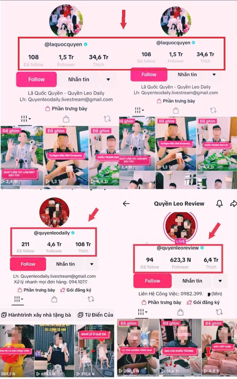 Các tài khoản TikTok được cho là sở hữu của vợ chồng Quyền Leo có hàng triệu lượt thích.