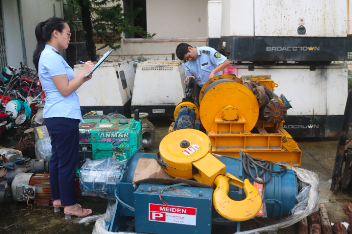 Khám phương tiện, lực lượng chức năng phát hiện trên xe vận chuyển 1 chiếc xe nâng hiệu MITSUBISHI, 10 cái máy đầm đất hiệu Mikasa, 3 cái máy nén khí trục vít hiệu HITACHI, TANABE, 2 bộ pa lăng cáp điện hiệu MEIDEN, ISK.