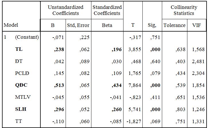 Bảng 2 cho thấy tất cả giá trị dung sai đều lớn hơn 0,6; các giá trị VIF từ 1,000 đến 1,032 đều nhỏ hơn 2, cho ta khẳng định rằng hiện tượng đa cộng tuyến không là vấn đề nghiêm trọng đối với các biến dùng trong dự báo mô hình hồi quy bội của nghiên cứu này. Giá trị t và mức ý nghĩa trong mô hình hồi quy bội xác định năm nhân tố chiến lược kinh doanh, công nghệ, định hướng thị trường kinh doanh, phân cấp quản lý và trình độ cán bộ nhân viên ảnh hưởng đến việc vận dụng KTQTCL với độ tin cậy 95% (p <0,05). Như vậy, giả thuyết H1, H2, H3, H4 và H5 được chấp nhận ở độ tin cậy 95%.