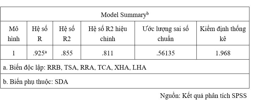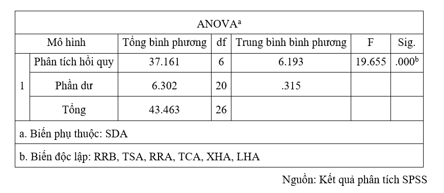 Kết quả phân tích hồi quy tuyến tính bội cho thấy mô hình có R² = 0.855 và R² được hiệu chỉnh bằng 0,811. R² được hiệu chinh= 0,811 nói lên độ thích hợp của mô hình là 81,1% hay nói cách khác là 81,1% sự biến thiên của biến SDA được giải thích chung của 6 biến quan sát. Như vậy, mô hình hồi quy tuyến tính bội đưa ra là phù hợp với dữ liệu và có thể sử dụng được.