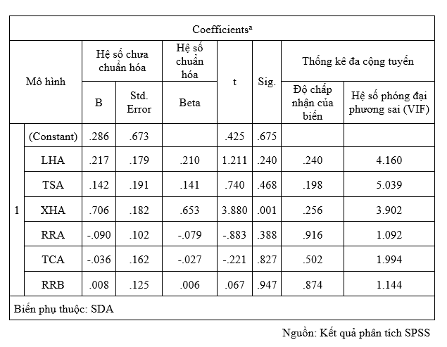 Kết quả phân tích hồi quy tuyến tính bội cho thấy mô hình có R² = 0.855 và R² được hiệu chỉnh bằng 0,811. R² được hiệu chinh= 0,811 nói lên độ thích hợp của mô hình là 81,1% hay nói cách khác là 81,1% sự biến thiên của biến SDA được giải thích chung của 6 biến quan sát. Như vậy, mô hình hồi quy tuyến tính bội đưa ra là phù hợp với dữ liệu và có thể sử dụng được.