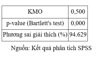 Đối với biến phụ thuộc, kết quả phân tích nhân tố khám phá cho thấy các biến quan sát hình thành duy nhất một nhân tố, các hệ số factor loading đều lớn hơn 0.5, hệ số KMO lớn hơn 0.5 (KMO = 0.500), kiểm định Bartlett có ý nghĩa thống kê (p = 0.000 < 0.05), phương sai giải thích lớn hơn 50% (94.629%) (Bảng 5). Điều này cho thấy việc sử dụng phân tích nhân tố khám phá là phù hợp với dữ liệu nghiên cứu, biến phụ thuộc là thang đo đơn hướng.