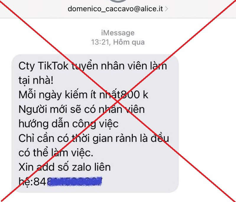 Cụ thể, nhiều người dân đã nhận được các tin nhắn mạo danh Công ty TikTok với nội dung như: “Cty TikTok tuyển nhân viên làm tại nhà. Mỗi ngày kiếm ít nhất 800K. Người mới sẽ có nhân viên hướng dẫn công việc. Chỉ cần có thời gian rảnh là đều có thể làm việc. Xin add số zalo liên hệ:xxxxxxxxxx.”
