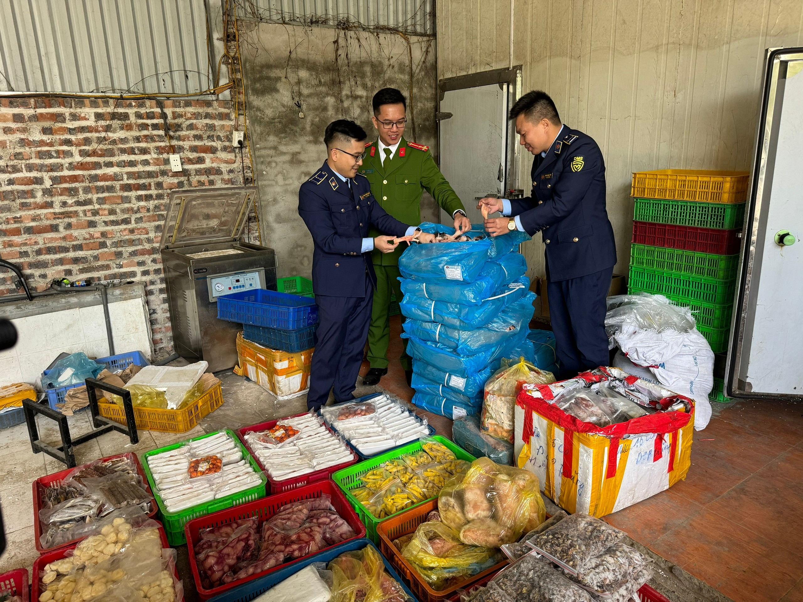 Vào hồi 09 giờ 50 phút, ngày 21/12/2023 tại Tổ 6, phường Đề Thám, TP. Cao Bằng, tỉnh Cao Bằng, Đội Quản lý thị trường số 5 phối hợp với Đội 389 tỉnh phát hiện hộ kinh doanh Phạm Thị Thêu, địa chỉ thường trú: xã Tự Lập, huyện Mê Linh, thành phố Hà Nội là chủ kho hàng thực phẩm đông lạnh địa chỉ: Tổ 6, phường Đề Thám, TP. Cao Bằng, điểm tập kết hàng hóa của hộ kinh doanh này có diện tích khoảng 150m2, nằm sâu trong khu dân cư và luôn trong tình trạng “cửa đóng then cài”. Tại thời điểm khám trong kho đông lạnh của bà Phạm Thị Thêu có chứa một lượng lớn thực phẩm động lạnh không rõ nguồn gốc, xuất xứ gồm: Trứng gà non đông lạnh; Kê gà đông lạnh; Dế mèn đông lạnh; Đậu viên thả lẩu; Khoai lang sấy; Chân gà đông lạnh; Xương cá hồi; Thịt trâu khô; ốc đông lạnh; Cá biển đông lạnh… chảy nước, bốc mùi hôi thối có tổng trọng lượng lên đến gần 400 kg, tổng trị giá hàng hóa vi phạm khoảng 30 triệu đồng.
