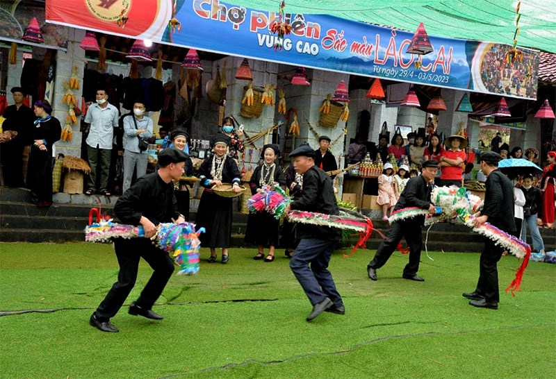 | Biểu diễn văn nghệ dân gian tại Chợ phiên “Sắc màu Lào Cai”. |