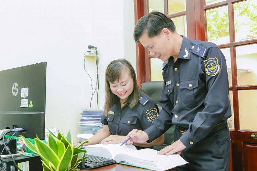 Công chức Hải quan Bạc Liêu trao đổi việc áp mã số hàng hóa trong thực thi nhiệm vụ. Ảnh: Nguyễn Việt Dũng.