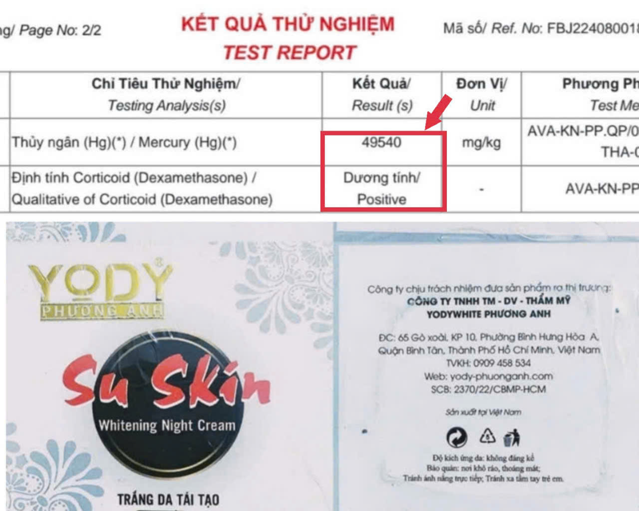 Kết quả kiểm nghiệm lần 1 của Quỹ Chống hàng giả (nhằm đối chứng thông tin của người tiêu dùng) chỉ ra rằng hàm lượng thủy ngân có trong 1 sản phẩm mỹ phẩm mang thương hiệu Yody Phương Anh là 49540 mg/kg (bình thường dưới 1mg/kg).Theo thông tin từ cơ quan chức năng tỉnh Thái Bình, sản phẩm Su Skin Whitening Ninght Cream đã bị phát hiện chứa thủy ngân. Điều này đã làm dấy lên lo ngại đối với những người đã và đang sử dụng sản phẩm.