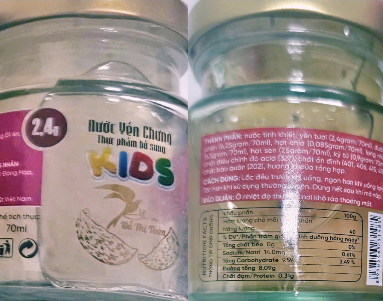 Cụ thể, trên một mẫu sản phẩm yến hũ (70 ml) có ghi: “Chứa 6g yến tươi”, bảng chỉ tiêu dinh dưỡng ghi hàm lượng đạm/protein chỉ 0.35g/100g. Thế nhưng, đối với dòng sản phẩm dành cho trẻ em (hũ 70 ml) “chứa 2.4g yến tươi”, lại có chỉ tiêu đạm/protein 0.31g/100g (gần tương đương nhau về độ đạm/protein). Điều này khiến các chuyên gia dinh dưỡng đặt nghi vấn lớn về độ tin cậy của các bảng thông tin dinh dưỡng trên sản phẩm.