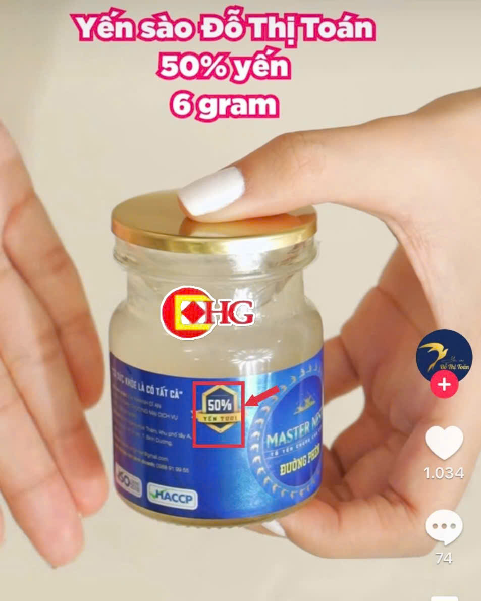 Yến hũ 70 ml mang thương hiệu Đỗ Thị Toán Master Nest chứa 50% yến tươi, trong một video quảng cáo từng trên nền tảng TikTok từng khẳng định có đến 6gram yến.