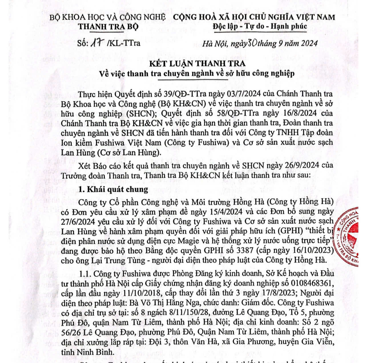 Tại kết luận thanh tra số 17/KL-Ttra của Bộ Khoa học và Công nghệ ngày 30/9/2024, một lần nữa khẳng định về hành vi vi phạm của Công ty Fushiwa đối với GPHI của Công ty Hồng Hà.