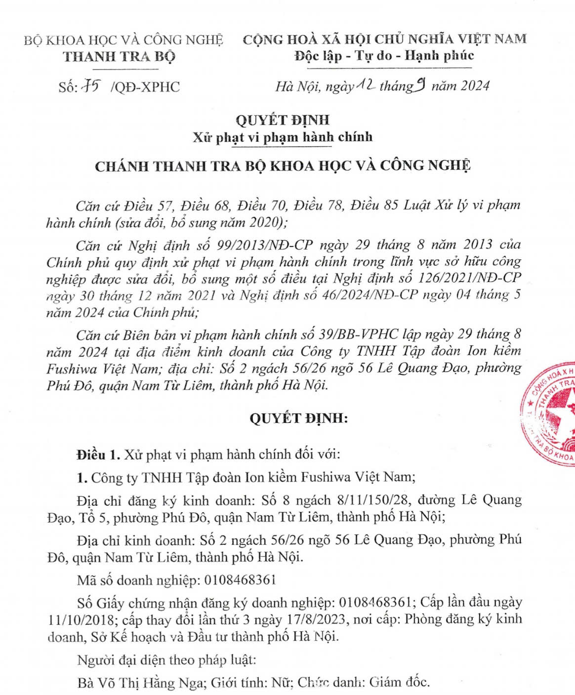 Ngày 12/9/2024 thanh tra Bộ Khoa học và Công nghệ ra quyết định xử phạt vi phạm hành chính số 75/QĐ-XPHC đối với Công ty Fushiwa Việt Nam đã có hành vi: “Sản xuất máy lọc nước xâm phạm quyền đối với bằng độc quyền GPHI “thiết bị điện phân nước sử dụng cực Magie và hệ thống xử lý nước uống trực tiếp” đang được bảo hộ theo Bằng độc quyền giải pháp hữu ích số 3387 (cấp ngày 16/10/2023) cho Công ty Cổ phần Công nghệ và môi trường Hồng Hà theo quy định tại Điều 126 Luật Sở hữu trí tuệ”, với số tiền là 78 triệu đồng. Đồng thời: “Đình chỉ có thời hạn một phần hoạt động sản xuất, kinh doanh”.