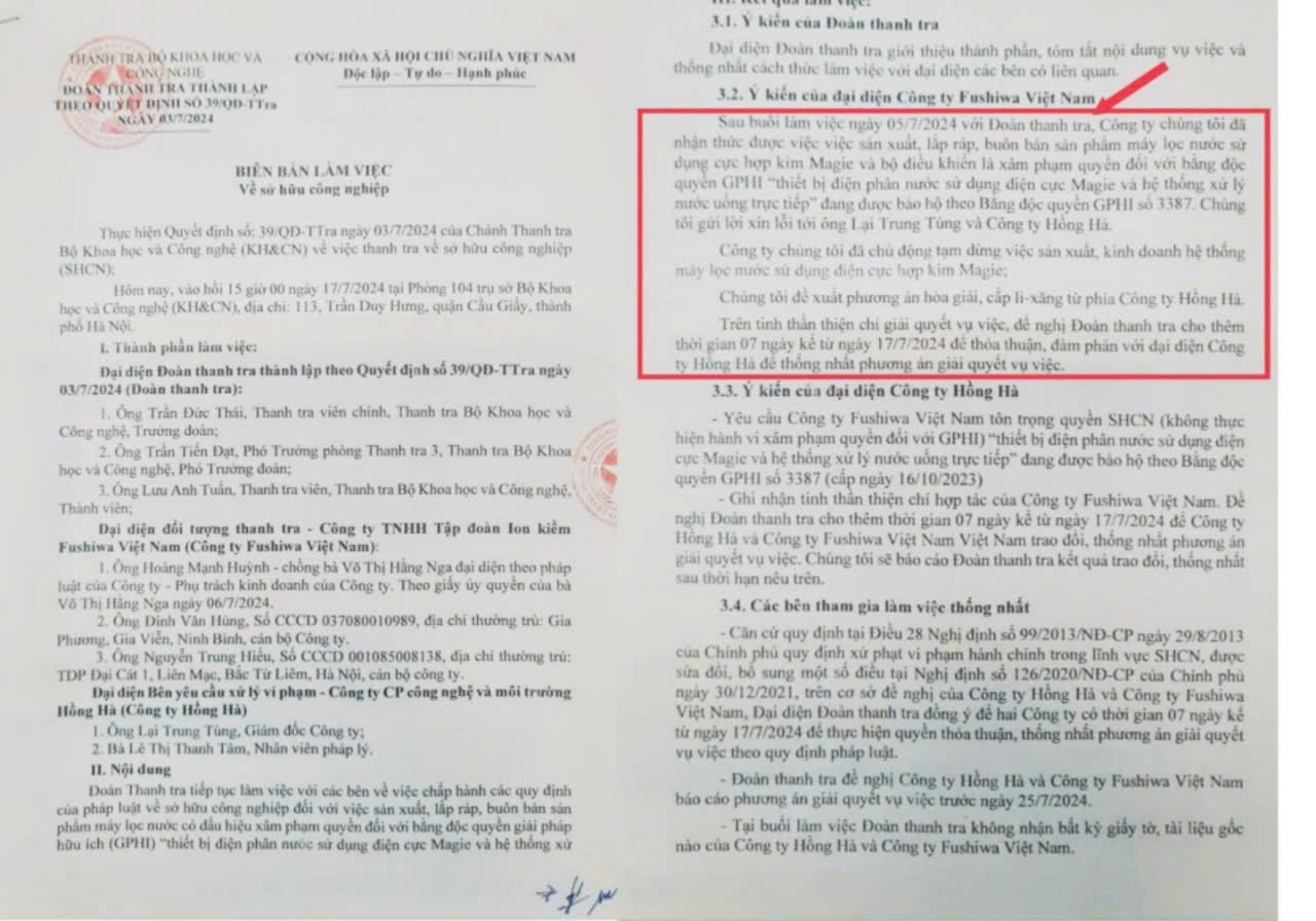 Trong quá trình làm việc, đại diện của Công ty Fushiwa Việt Nam thừa nhận hành vi xâm phạm GPHI: “Thiết bị điện phân nước sử dụng điện cực Magie và hệ thống xử lý nước uống trực tiếp” đã được Cục Sở Hữu Trí Tuệ cấp bằng độc quyền giải pháp hữu ích số 3387”.