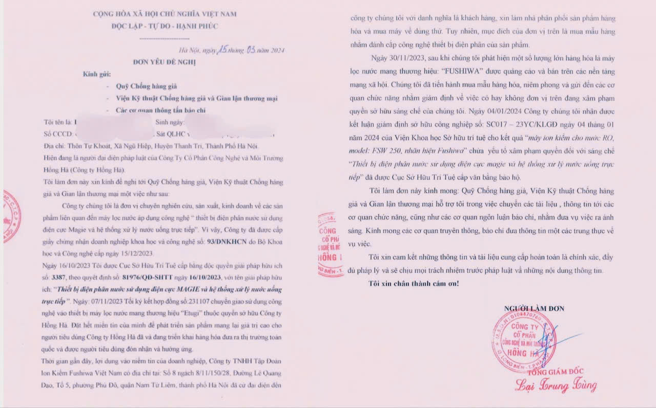 Đơn kêu cứu của Công ty Hồng Hà gửi Quỹ Chống hàng giả, Viện Kỹ thuật Chống hàng giả và Gian lận thương mại và các cơ quan báo chí về việc Công ty Fushiwa Việt Nam xâm hại nghiệm trọng giải pháp hữu ích "thiết bị điện phân nước sử dụng điện cực Magie và hệ thống xử lý nước uống trực tiếp" đang được bảo hộ theo bằng độc quyền số 3387.