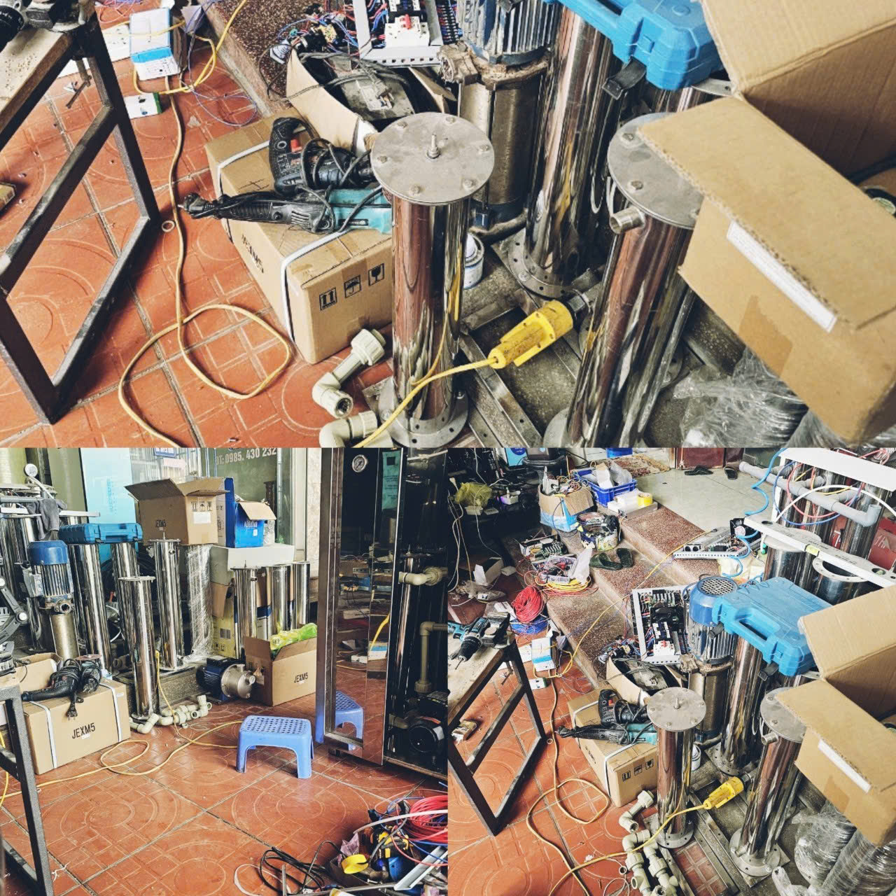 Nhiều linh phụ kiện, thiết bị và hệ thống điện (bảng vi mạch) để lắp ráp, hình thành các loại máy lọc nước nằm ngổn ngang trong một không gian chật hẹp (của trụ sở Công ty Lan Hùng)