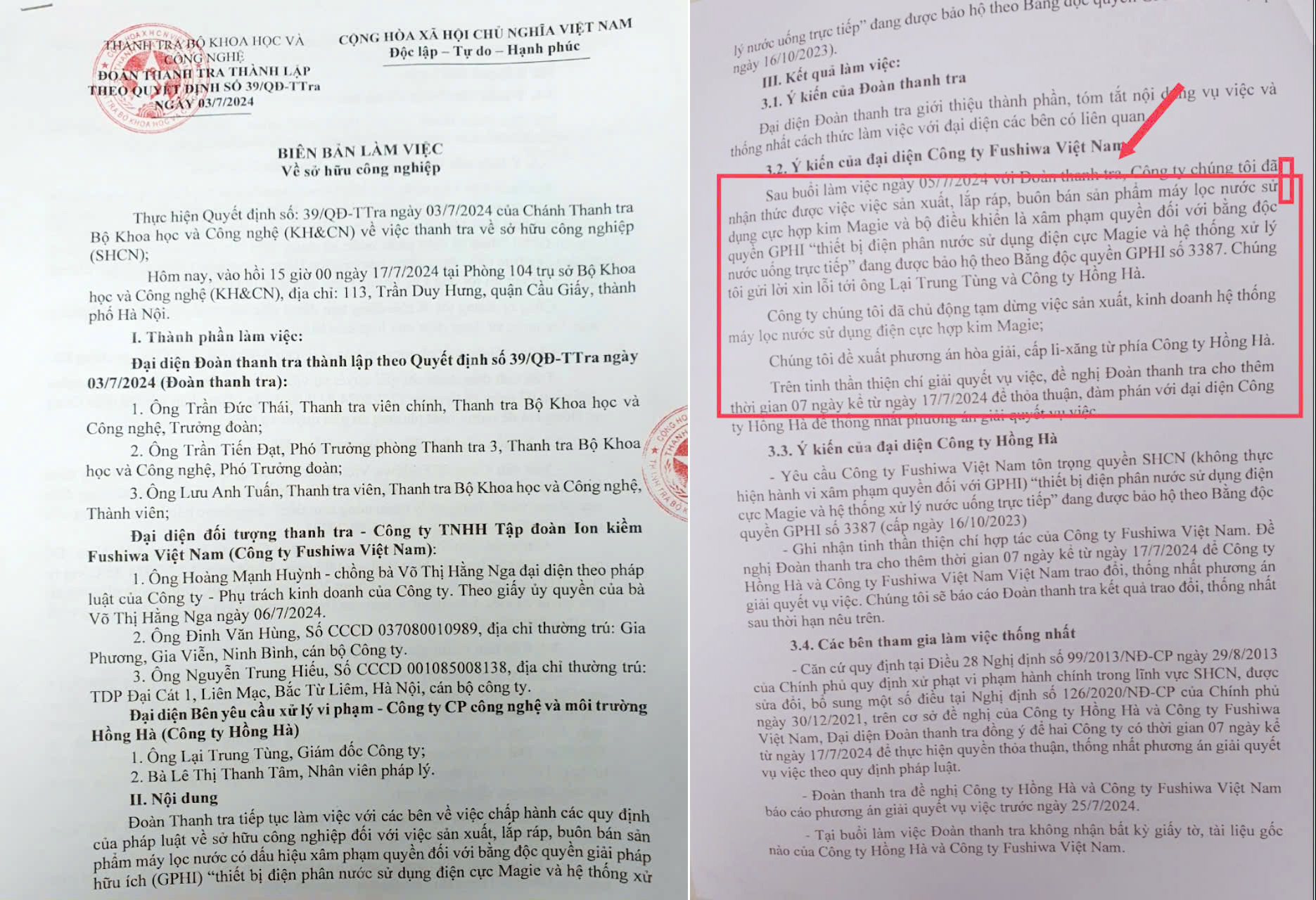 Trong quá trình làm việc, đại diện của Công ty Fushiwa Việt Nam thừa nhận hành vi xâm phạm giải pháp hữu ích: “Thiết bị điện phân nước sử dụng điện cực Magie và hệ thống xử lý nước uống trực tiếp” đã được Cục Sở Hữu Trí Tuệ cấp bằng độc quyền giải pháp hữu ích số 3387.
