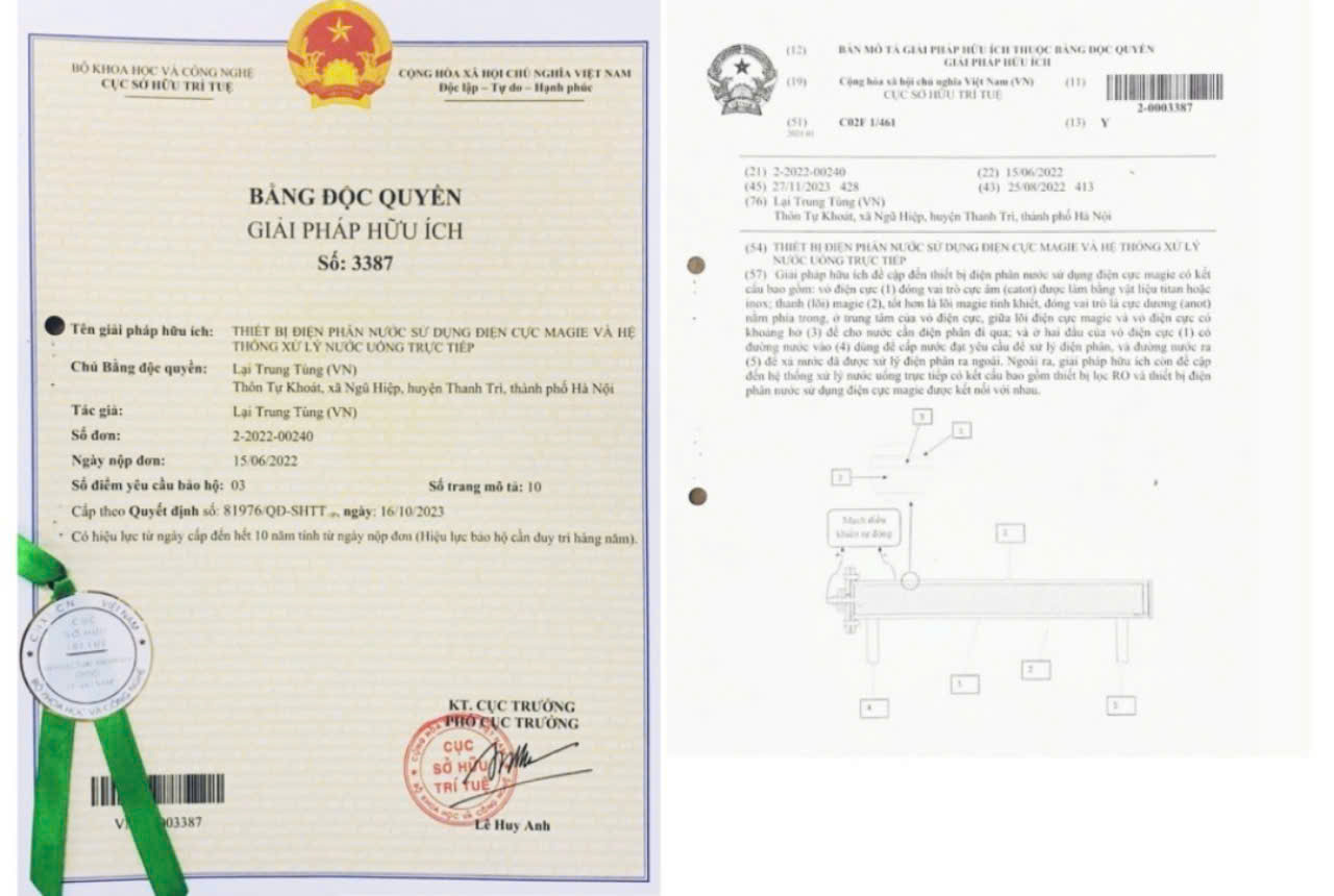 Bằng độc quyền giải pháp hữu ích: số 3387 do Cục Sở hữu trí tuệ kí ngày 16/10/2023 cấp cho Lại Trung Tùng về giải pháp hữu ích:" Thiết bị điện phân nước sử dụng điện cực MAGIE và hệ thống xử lý nước uống trực tiếp".