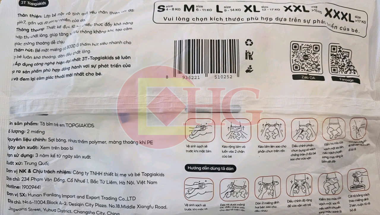Cụ thể, trong nội dung trao đổi của phóng viên (không phải là Công văn) được gửi tới Công ty TOPGIAKIDS, người tiêu dùng gửi thông tin tới Quỹ Chống hàng giả, sản phẩm “Bỉm quần TopGiakids 36 miếng” và “Tã bỉm 2 miếng” tặng kèm, được đơn vị trên nhập từ Trung Quốc và kinh doanh tại thị trường Việt Nam đang có dấu hiệu vi phạm quy định về nhãn hàng hóa: Bao bì thể hiện ngày sản xuất, hạn dùng, số lô bằng tiếng nước ngoài, không có chỉ dẫn bằng tiếng Việt, điều này vi phạm nghiêm trọng Thông tư số 05/2019/TT-BKHCN quy định chi tiết thi hành một số điều của Nghị định số 43/2017/NĐ-CP, được sửa đổi bổ sung Nghị định số 111/2021/NĐ-CP về việc nhãn hàng hóa.
