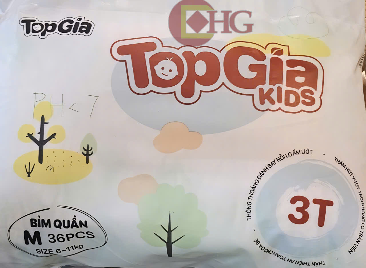 Tạp chí CHG chuyển thông tin (bàn giao từ Quỹ Chống hàng giả) tới Công ty TOPGIAKIDS về dấu hiệu vi phạm ghi nhãn và không thể hiện số hiệu tiêu chuẩn hàng hóa của Bỉm quần M36PCS và sản phẩm khuyến mại Tã bỉm 2PCS mang thương hiệu TOPGIAKIDS.