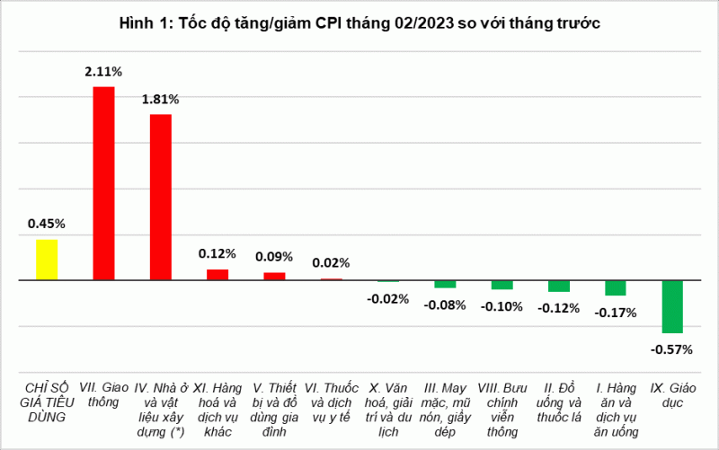 Diễn biến giá tiêu dùng tháng 2/2023 so với tháng trước của một số nhóm hàng hóa.
