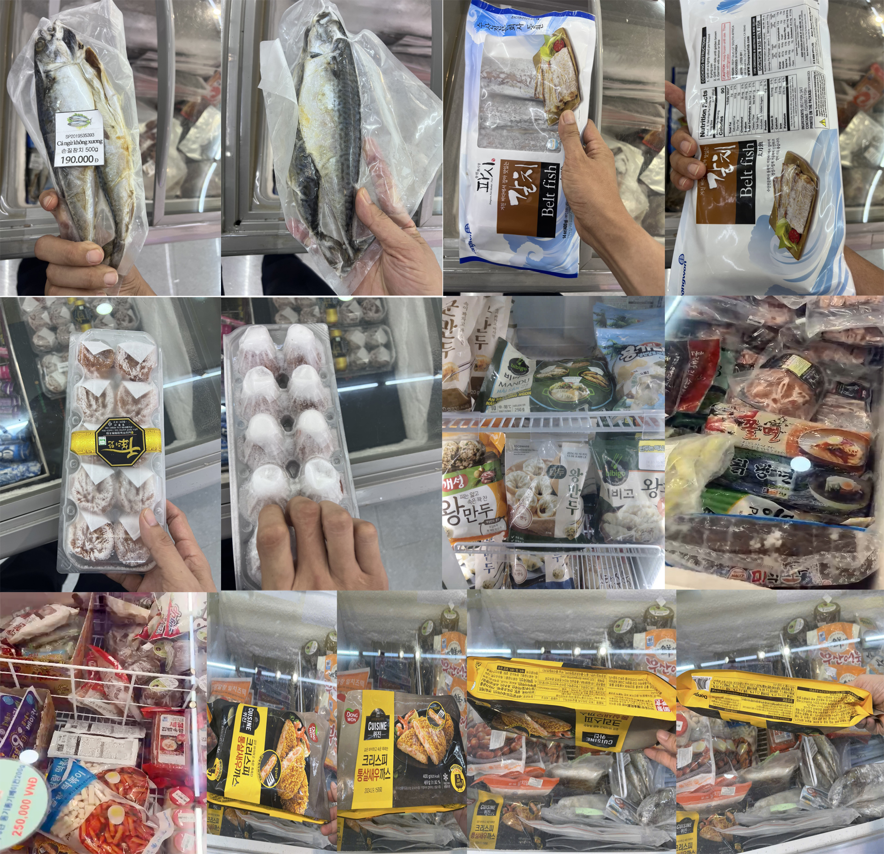 Một số mặt hàng hải sản đông lạnh tại đây đa phần là chữ nước ngoài, thiếu nhãn phụ tiếng Việt hoặc có nhãn phụ nhưng không đầy đủ thông tin theo quy định (ảnh ngày 15/8/2024).