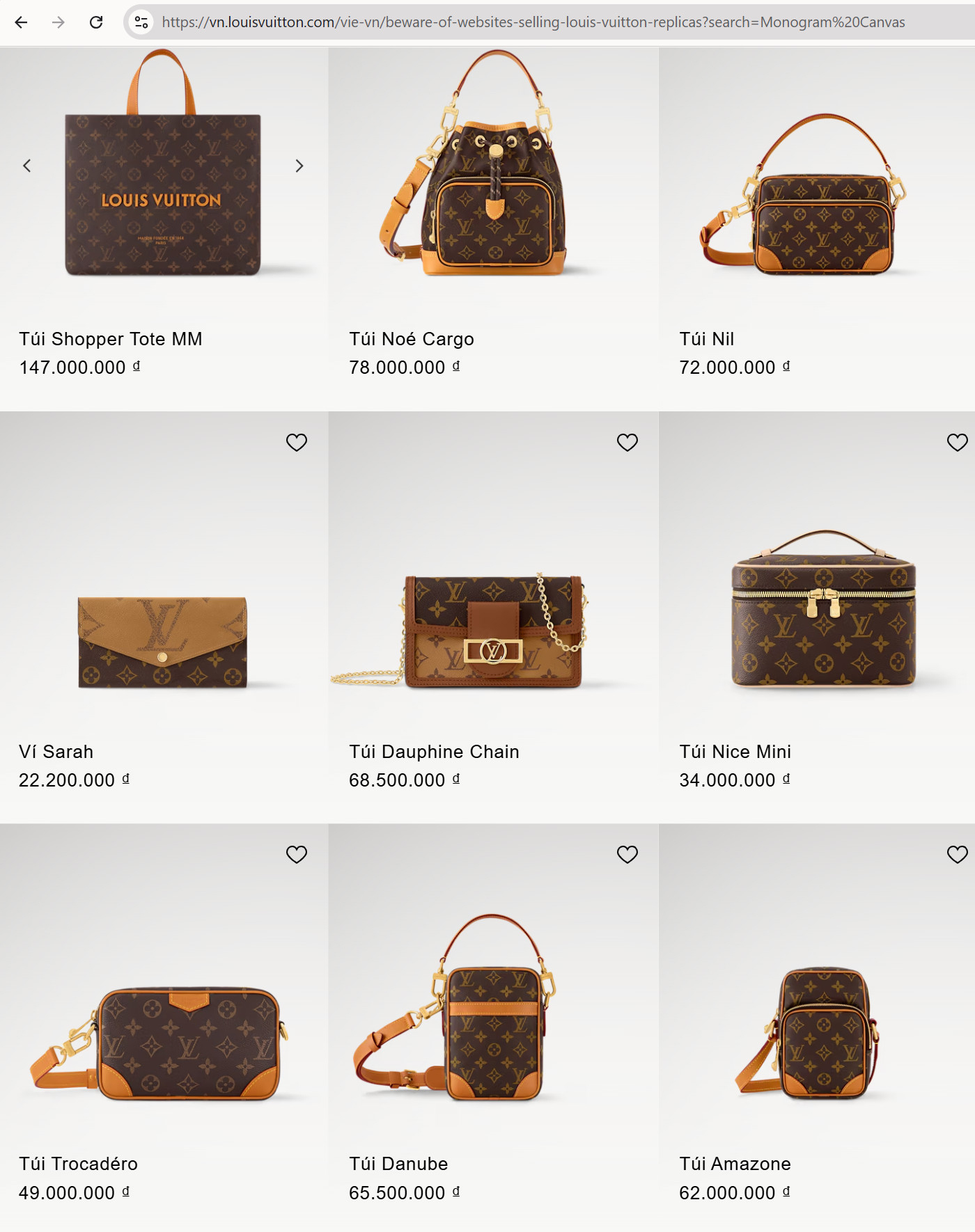 Túi xách thương hiệu LV trên trang website chính hãng Louis Vuitton có giá bán vài chục triệu đồng một sản phẩm.