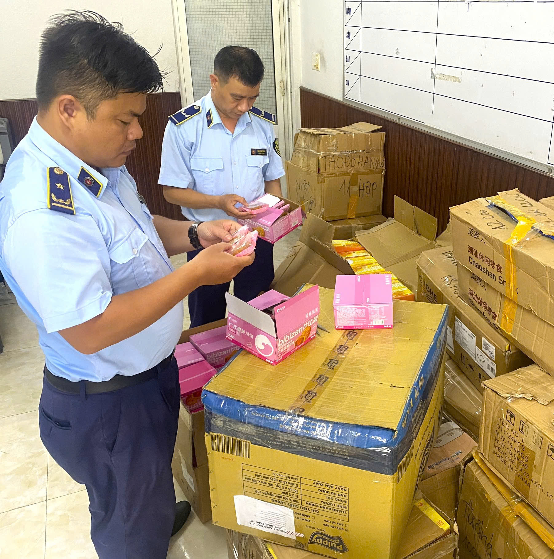 Lực lượng chức năng kiểm tra, phát hiện thực phẩm nhập lậu.