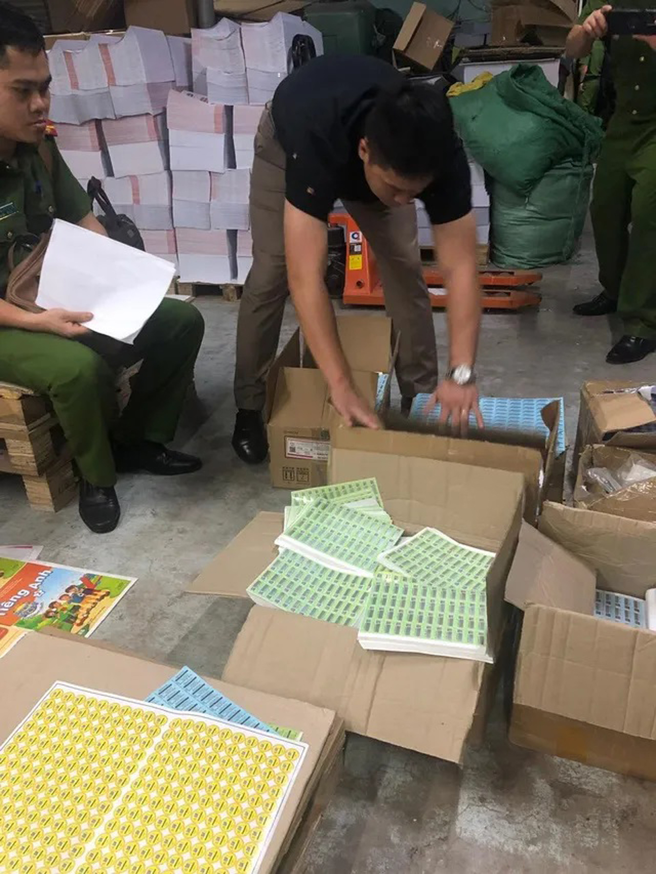 Tang vật thu giữ gồm 01 triệu con tem, 600.000 cuốn sách giả thành phẩm và bán thành phẩm, trị giá khoảng 12 tỷ đồng cùng toàn bộ máy in, máy cắt, máy đóng kim, máy may chỉ, máy dán keo, xe nâng, xe ô tô, tem giả, bản kẽm, giấy in...
