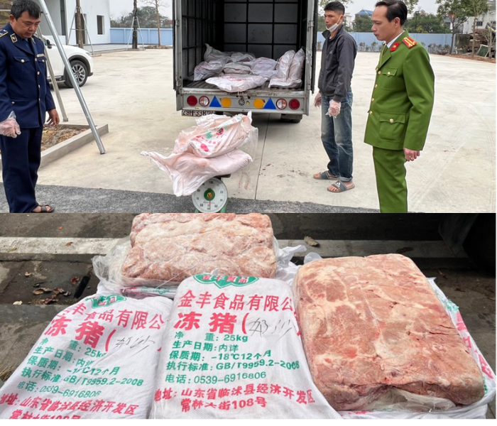 Tại tỉnh Thái Nguyên, rạng sáng ngày 8/3/2023, Tổ công tác Đội Quản lý thị trường số 4 Cục Quản lý thị trường tỉnh đã phối hợp với lực lượng Công an TP. Phổ Yên phát hiện và khám xét phương tiện vận tải đang dừng đỗ trên địa bàn. Trên tùng xe chứa 400kg sản phẩm phẩm là thịt lợn đã qua sơ chế, được hút chân không, được đóng gói với trọng lượng 500g/túi. Toàn bộ hàng hóa đã biến đổi màu sắc, bốc mùi hôi thối, không đảm bảo chất lượng, an toàn thực phẩm. Mở rộng kiểm tra, lực lượng chức năng đã phát hiện tại kho hàng ở nhà riêng của đối tượng có chứa trữ trên 3 tấn các sản phẩm từ lợn gồm đầu lợn, xương lợn, da lợn và lòng lợn các loại được mua gom từ nhiều nguồn. Tổng trọng lượng hàng hóa tại hai nơi khoảng gần 4 tấn.
