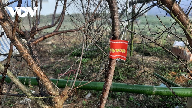 Theo người dân địa phương, đào năm nay nở hoa đúng dịp Tết và được dán tem để tiện cho việc mua bán. Giá đào ổn định như mọi năm, dao động từ 200.000 đồng đến 3 triệu đồng.