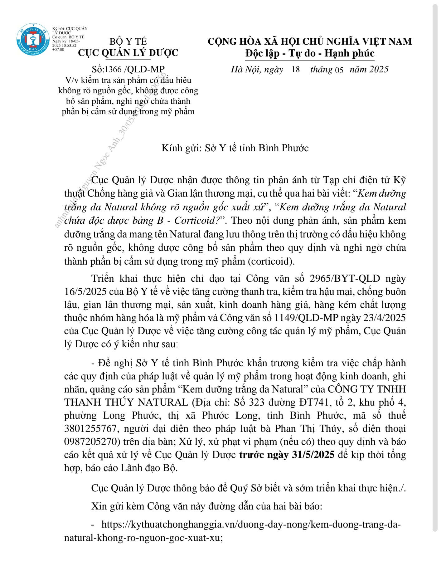 | Nội dung công văn 1366/QLD-MP của Cục Quản lý Dược, Bộ Y tế gửi Sở Y tế tỉnh Bình Phước: “Triền khai thực hiện chi đạo tai Công văn số 2965/BYT-QLD ngày16/5/2025 của Bộ Y tế về việc tăng cường thanh tra, kiểm tra hậu mại, chống buôn lậu, gian lận thương mại, sản xuất, kinh doanh hàng giả, hàng kém chắt luợng thuộc nhóm hàng hóa là mỹ phầm và Công văn số 1149/QLD-MP ngày 23/4/2025 của Cục Quàn lý Dược về việc tăng cường công tác quản lý mỹ phẩm, Cục Quản lý Dược đề nghị Sở Y tế tỉnh Bình Phước khẩn trương kiểm tra việc chấp hành các quy định của pháp luật về quản lý mỹ phẩm trong hoạt động kinh doanh, ghi nhãn, quảng cáo sản phầm "Kem dưỡng trắng da Natural" của Công ty TNHH Thanh Thúy Natural (Đia chi: S6 323 dường ĐT741, tổ 2, khu phố 4, phường Long Phước, thị xã Phước Long, tinh Bình Phước)... Xử lý, xử phạt vi phạm (nếu có) theo quy định và báo cáo kết quả xử lý về Cục Quản lý Dược trước ngày 31/5/2025 để kịp thời tổng hợp, báo cáo Lãnh đạo Bộ”. |