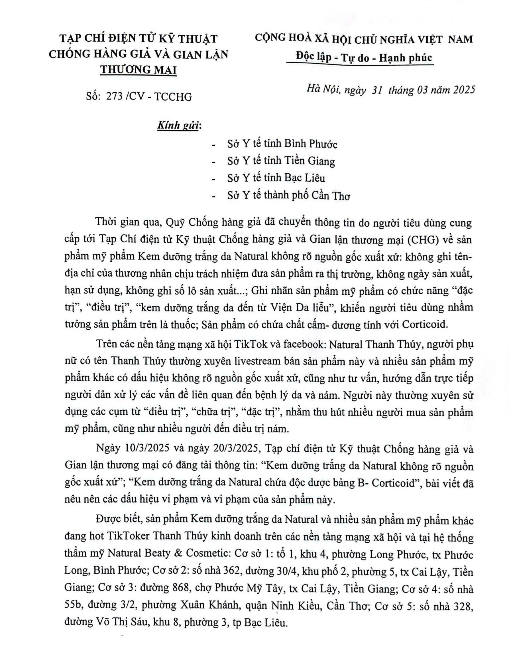 Tạp chí CHG gửi công văn tới Sở Y tế các tỉnh, thành về việc trao đổi thông tin liên quan đến sản phẩm mỹ phẩm mang thương hiệu Thanh Thúy Natural.Trước đó, ngày 31/3/2025, Tạp chí CHG đã có công văn số 273, gửi Sở Y tế tỉnh Bình Phước; Sở Y tế tỉnh Tiền Giang; Sở Y tế tỉnh Bạc Liêu và Sở Y tế thành phố Cần Thơ với nội dung: thông tin về những dấu hiệu vi phạm và vi phạm của Công ty TNHH Thanh Thúy Natural (vì đơn vị này đang kinh doanh mỹ phẩm mang thương hiệu Thanh Thúy Natural tại các tỉnh thành trên). Tuy nhiên, đến nay, mặc dù đã gần gần 70 ngày trôi qua, các Sở Y tế nói trên vẫn chưa có bất kỳ thông tin phản hồi liên quan đến vụ việc.