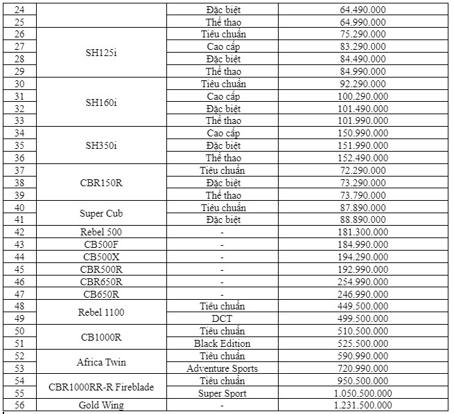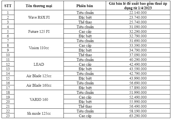 (CHG) Vừa qua, Công ty Honda Việt Nam (HVN) chính thức điều chỉnh giá bán lẻ đề xuất của các mẫu xe máy do HVN sản xuất và phân phối nội địa.