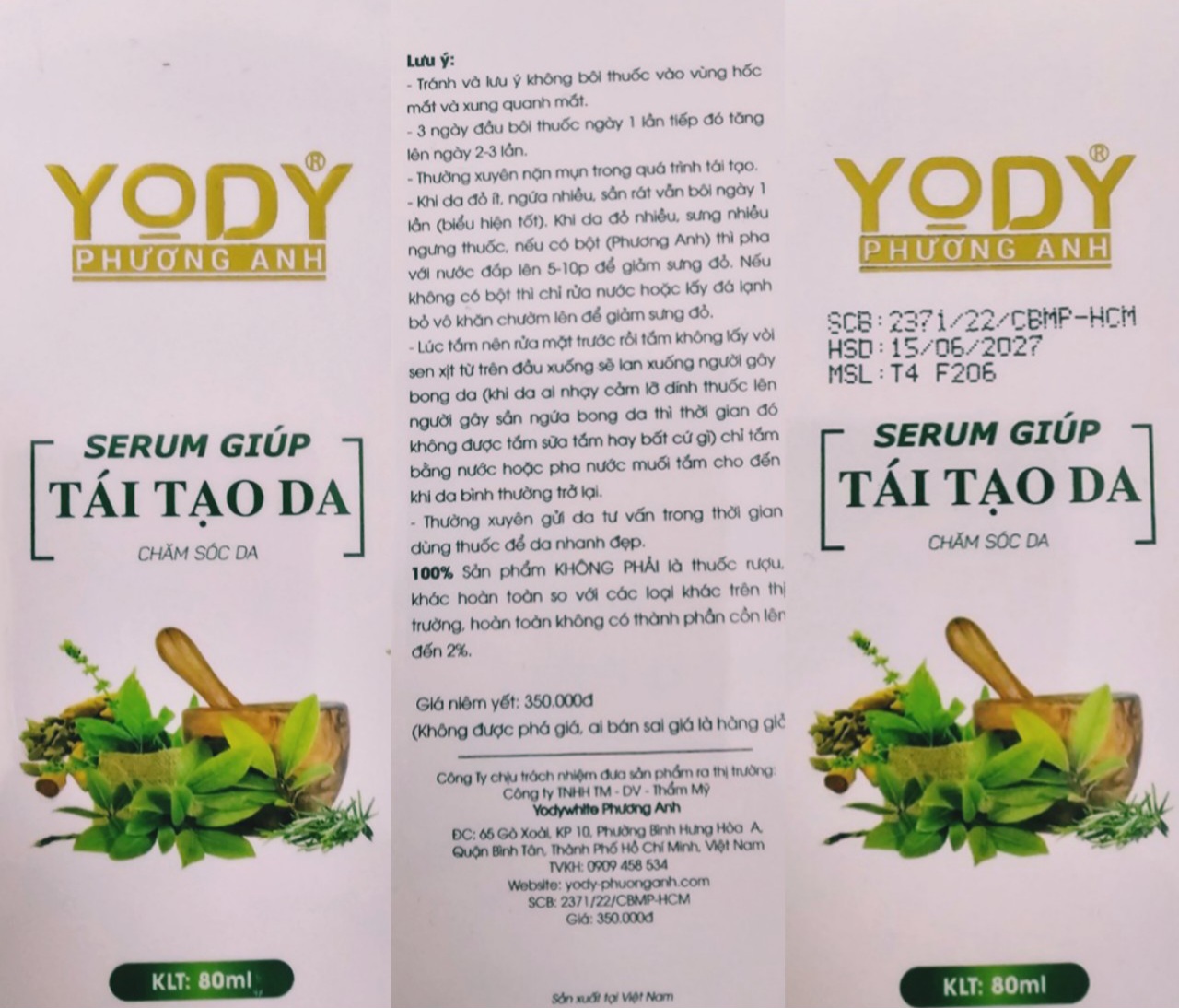 Các sản phẩm Yody Phương Anh là SERUM tái tạo da; HSD 16/03/2027 MSL: T4 C255 (2371/22/CBMP-HCM): ghi thêm các cụm từ “trị các vấn đề về da, tái tạo làn da mới, chống lão hóa”, trong phần Hướng dẫn sử dụng. Lưu ý an toàn có sử dụng các cụm từ “ngưng tất cả mỹ phẩm trước 1-2 ngày khi dùng thuốc”, “dùng trực tiếp hay bôi thuốc lên mặt, bôi thuốc một ngày 2-3 lần”, “không bôi thuốc vào vùng hốc mắt” “thường xuyên nặn mụn trong quá trình tái tạo”...