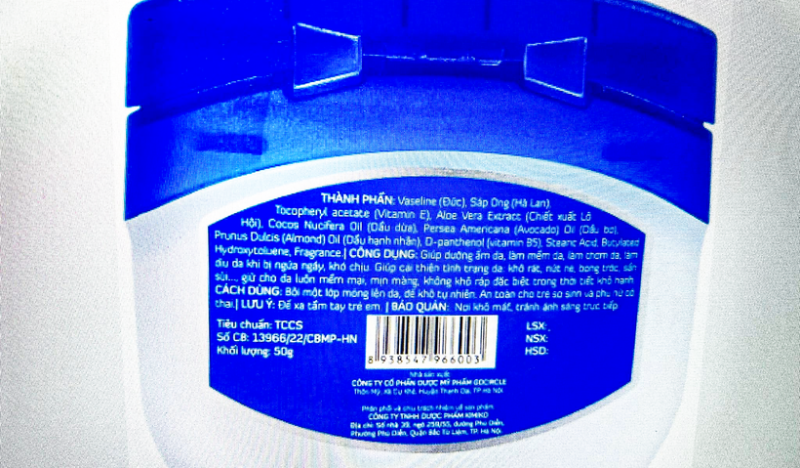 Lô sản phẩm Vaseline Vitamin E bị thu hồi trên toàn quốc có số 251022, sản xuất ngày 25/10/2022, hạn dùng 25/10/2025. Trên nhãn ghi thông tin số CB: 13966/22/CBMP-HN; Phân phối và chịu trách nhiệm về sản phẩm là Công ty TNHH dược phẩm Kimiko (địa chỉ:số nhà 39, ngõ 259/55 đường Phú Diễn, phường Phú Diễn, quận Bắc Từ Liêm, Hà Nội).