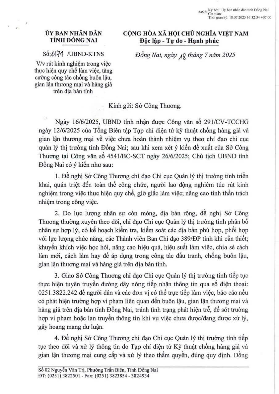 Trước đó, ngày 18/7/2025, sau khi nhận được công văn của Tạp chí Điện tử Kỹ thuật Chống hàng giả và Gian lận thương mại, UBND tỉnh Đồng Nai đã ra văn bản số: 1171/UBND-KTNS đề nghị Sở Công thương tỉnh Đồng Nai chỉ đạo Chi Cục Quản lý thị trường tỉnh rút kinh nghiệm trong việc thực hiện quy chế làm việc, tăng cường công tác chống buôn lậu, gian lận thương mại và hàng giả trên địa bàn tỉnh..