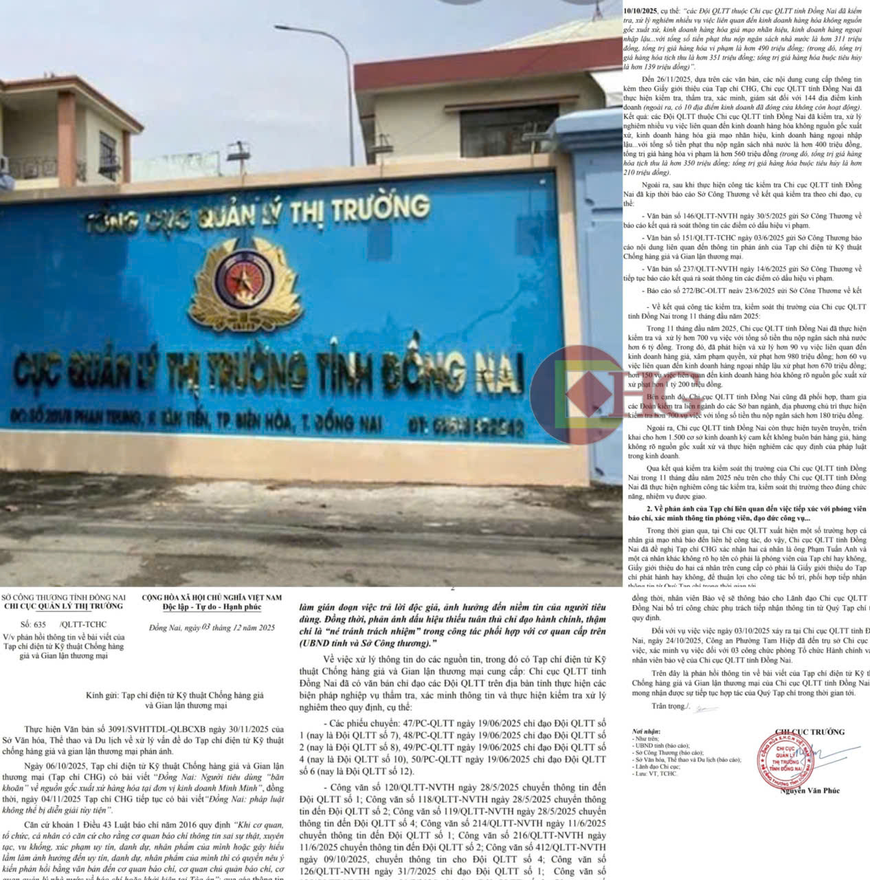 (CHG) Công văn số 635/QLTT-TCHC do ông Chi cục trưởng, Chi cục Quản lý thị trường (QLTT) tỉnh Đồng Nai Nguyễn Văn Phúc ký ngày 03/12/2025 gửi Tạp chí CHG, đồng thời gửi UBND tỉnh và nhiều sở, ngành liên quan, đang đặt ra những vấn đề đáng quan ngại về tính lôgic, tính khoa học và mức độ liêm chính hành chính trong phản hồi thông tin báo chí.