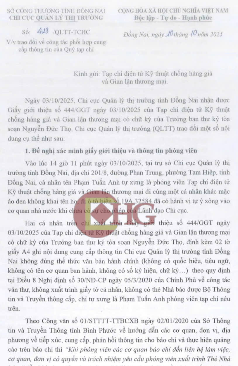 Công văn số 423/QLTT-TCHC ngày 10/10/2025 của Chi cục Quản lý thị trường tỉnh Đồng Nai có dấu hiệu vu khống, xúc phạm danh dự nhà báo, phóng viên Tạp chí điện tử Kỹ thuật Chống hàng giả và Gian lận thương mại.Ngược lại, video do phóng viên giải trình toàn bộ quá trình đến chuyển thông tin tại phòng văn thư của Chi cục QLTT tỉnh Đồng Nai lại cho thấy không có hành vi gây rối hoặc cản trở hoạt động công vụ. Bên cạnh đó, video giải trình lại cho thấy tại phòng văn thư, nữ công chức văn thư của đơn vị này lại không thực hiện mặc đồng phục của ngành.