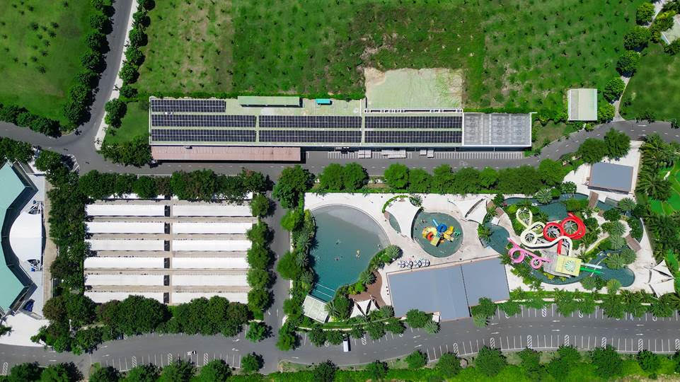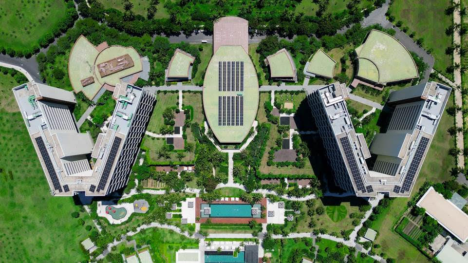 Alma Resort sắp hoàn thành việc lắp đặt 4.476 tấm pin năng lượng mặt trời với tổng diện tích 23.290m2 cho toàn bộ hệ thống mái lợp của 196 biệt thự, hai tòa nhà chữ V với 384 căn hộ, sảnh đón khách và tòa nhà tiện ích.