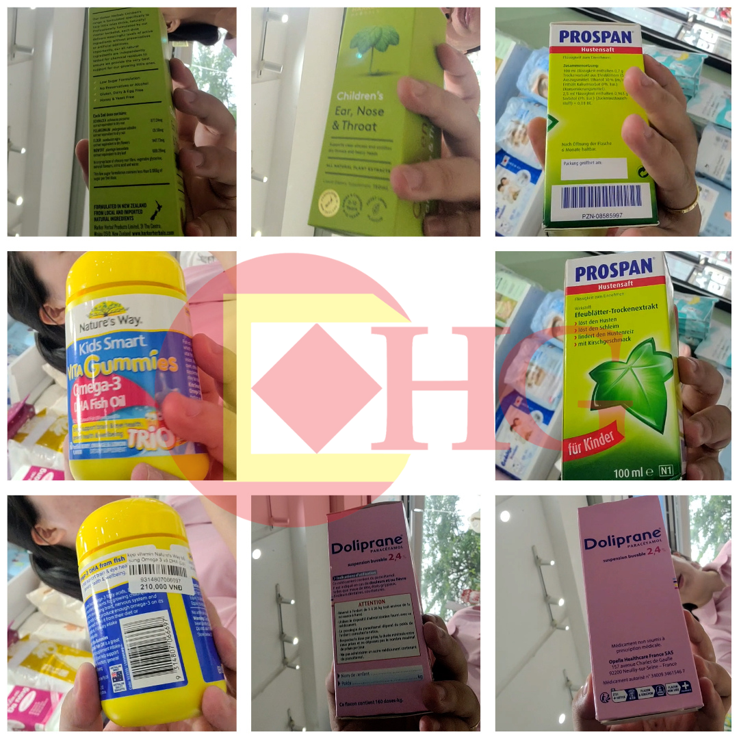 Tại cửa hàng trên, phóng viên ghi nhận rất nhiều hàng hóa dành cho mẹ và bé như: sữa, thực phẩm chức năng, thực phẩm ăn liền, quần áo, đồ chơi,… thậm chí một số sản phẩm là thuốc tân dược (thuốc ho ProsPan, thuốc hạ sốt Doliprane). Các sản phẩm trên có chữ nước ngoài, thiếu nhãn phụ tiếng Việt hoặc có nhãn phụ nhưng không đầy đủ thông tin theo quy định của pháp luật.