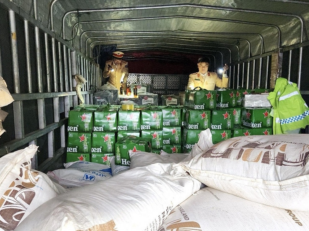 Qua kiểm tra, lực lượng chức năng phát hiện tại khu vực thùng xe tải có chứa các mặt hàng hóa, gồm: 150 thùng bia Heineken, 80 thùng rượu Black, 10 thùng bia Dark, 30 thùng bia Pilsnerurquell, 100 bao đường kính.