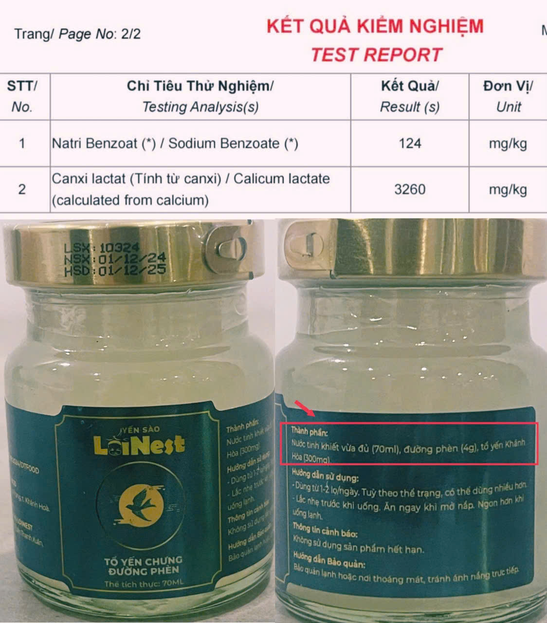 Kết quả kiểm nghiệm đối chứng của Quỹ Chống hàng giả chỉ ra rằng trong sản phẩm Yến sào Loinest có chứa thành phần bắt buộc phải ghi trên nhãn hàng hóa.Tuy nhiên, theo kết quả kiểm nghiệm đối chứng từ Quỹ Chống hàng giả, trong sản phẩm hũ yến sào Loinest 70ml, ngoài ba thành phần được in trên nhãn kể trên, còn phát hiện hai chất phụ gia mà không được ghi trên nhãn hàng hóa: Natri Benzoate/ Sodium Benzoate (hàm lượng 124mg/kg), một chất bảo quản có thể gây hại nếu sử dụng quá liều và Canxi lactat (Tính từ canxi)/ Calcium lactate (hàm lượng 3260mg/kg), một chất thường được sử dụng trong thực phẩm để cải thiện cấu trúc hoặc bổ sung khoáng, nhưng bắt buộc phải ghi rõ trên nhãn nếu có.