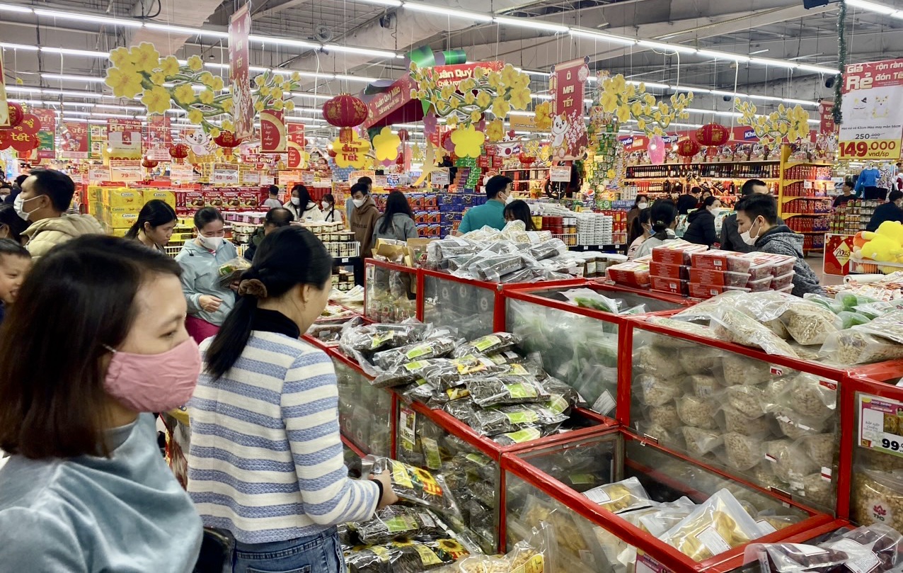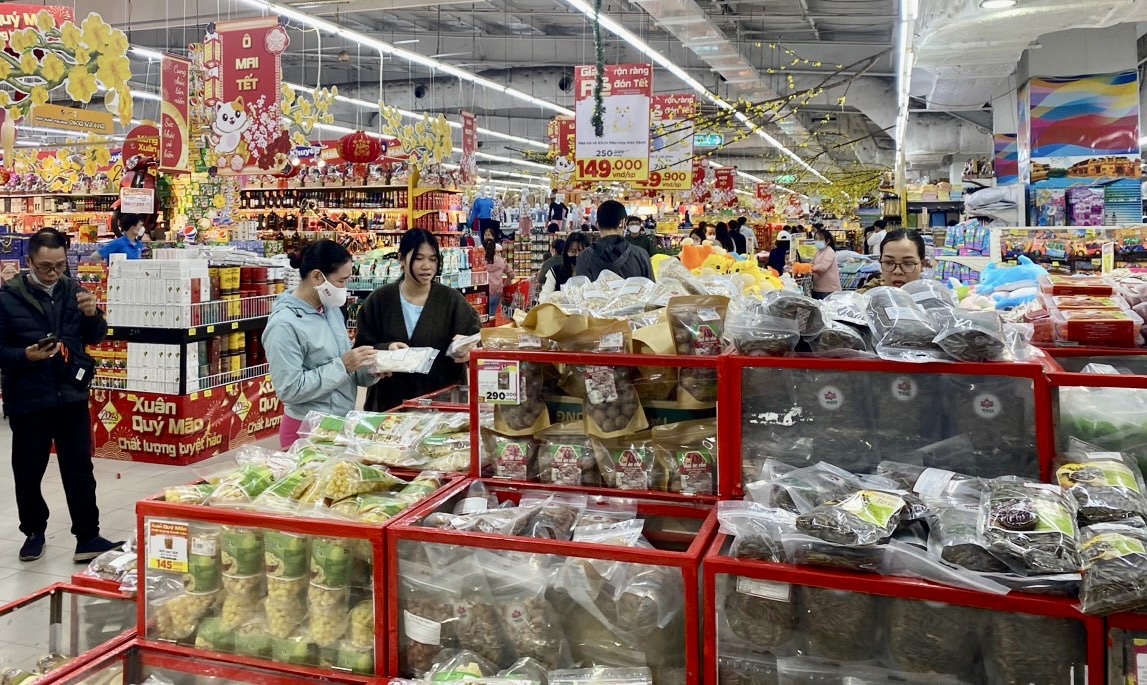 Dịp Tết, ngoài thực phẩm tươi sống và thực phẩm chế biến sẵn, người tiêu dùng thường mua sắm nhiều nhất là các mặt hàng bánh mứt kẹo, trà, nước giải khát, thực phẩm khô.