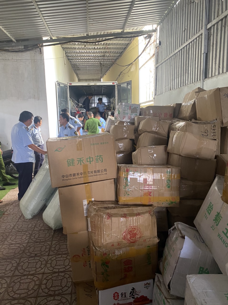 Tang vật tạm giữ, niêm phong gồm: 517 túi trà thành phẩm, 43 kg hàng hóa bán thành phẩm và 1.773kg nguyên liệu dùng để sản xuất hàng hóa, trong đó có 1.270 kg nguyên liệu (hoa cúc, táo lát, táo đỏ, hoa hồng, hoa nhài, kỷ tử, dâu tằm, táo đen) có nhãn gốc bằng tiếng nước ngoài không có nhãn phụ bằng tiếng Việt Nam và 503 kg nguyên liệu (đinh lăng, sâm tố nữ) không ghi nhãn.