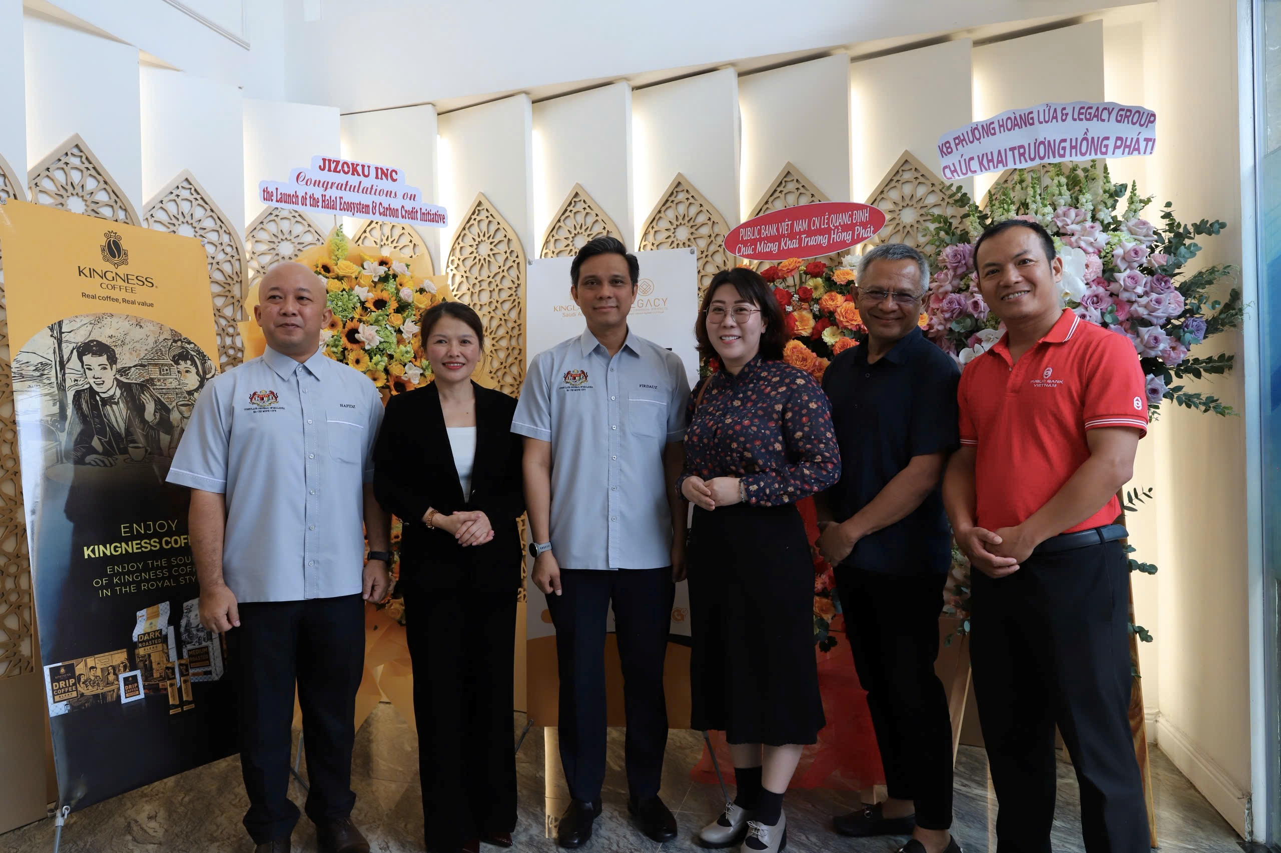 Bà Nguyễn Thị Hồng Thuỷ ( thứ 2, từ trái qua) - Founder, CEO Kinglands; ông Firdauz Othman- Tổng lãnh sự quán Malaysia ( thứ 3, từ trái qua); ông Ramlan Bin Osman- Giám đốc bộ phận chứng nhận Halal- HACERT ( thứ 5, từ trái qua) chụp ảnh cùng các doanh nghiệp Halal.