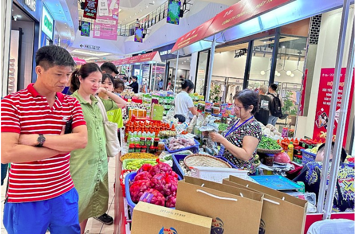 (CHG)Tối 8/6, tại Trung tâm thương mại AEON MALL Hà Đông (phường Dương Nội, quận Hà Đông, Hà Nội) đã khai mạc Hội chợ xúc tiến thương mại nông nghiệp, sản phẩm OCOP Hà Nội 2023. Hội chợ lần này thu hút khoảng 70 gian hàng, diễn ra trong 4 ngày từ 8-11/6.