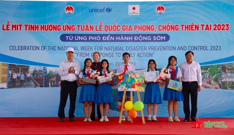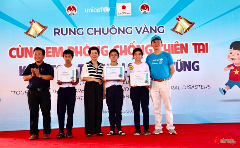 Đại diện học sinh các trường trung học cơ sở TP. Hội An (Quảng Nam) nhận thưởng cuộc thi “Rung chuông vàng: Cùng em phòng, chống thiên tai - Kiến tạo tương lai bền vững”, một trong những hoạt động hưởng ứng của chủ nhà Việt Nam.